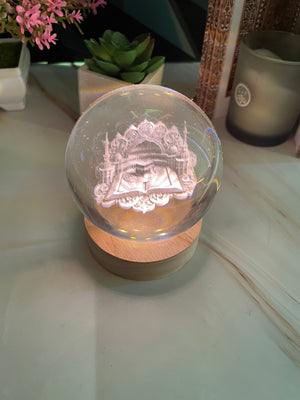 Illuminate your space with this stunning handmade Islamic crystal light. Featuring intricate 3D engravings of sacred Islamic symbols, each piece serves as a beautiful reminder of faith, peace, and unity.