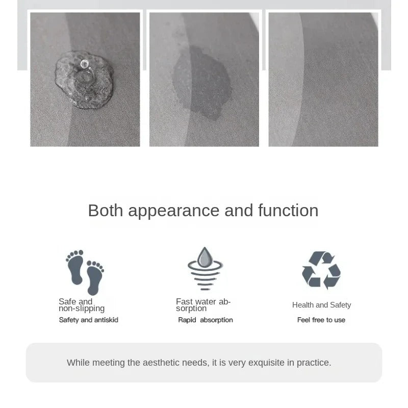 The bath mat features a 4-layer design including PVC, technical velvet, multi-layer composite diatom mud. It is highly absorbent, dries quickly, and has a non-slip rubber bottom.